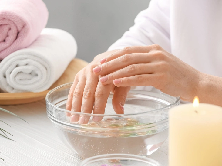 Также можно делать солевые ванночки для рук с добавлением жирорастворимых витаминов А и Е, которые можно приобрести в аптеке, или эфирных масел (пачули, апельсин, мята). К слову, витамин Е можно наносить на кутикулу и ногтевую пластину для их укрепления и питания.