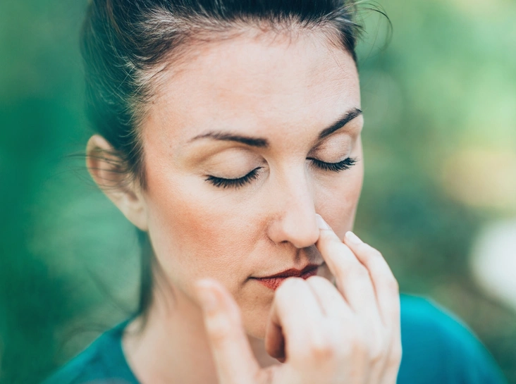 Сядьте в удобное положение с прямой спиной. Вы можете сидеть на полу по-турецки или даже на стуле – главное, чтобы вас ничего не отвлекало и не тревожило. Левую руку положите на левое колено или бедро, на правой руке указательный и средний палец прижмите к середине ладони, остальные выпрямите. Перекройте левую ноздрю безымянным пальцем и мизинцем правой руки. Сделайте вдох через правую ноздрю, на выдохе большим пальцем перекройте правую ноздрю и выдыхайте через левую. Совершите от 5-10 таких циклов через одну ноздрю, далее поменяйте и повторите всю комбинацию через правую ноздрю вдох, выдох – через левую.