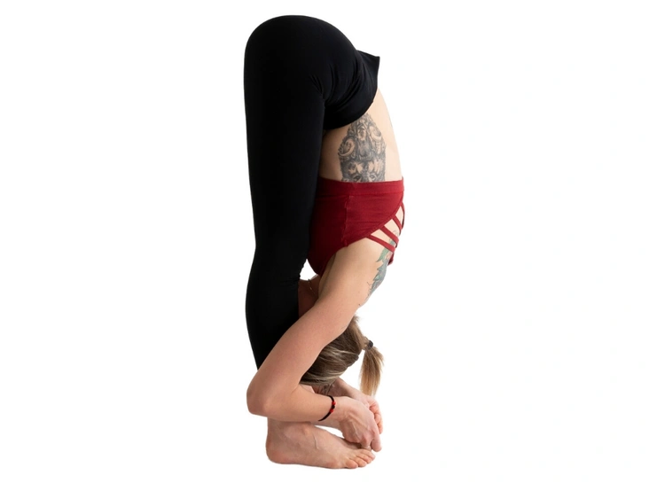 Расставьте стопы на ширине таза параллельно друг другу, на вдохе наклоняясь вниз возьмитесь за большие пальцы стоп, с выдохом, сгибая локти по направлению назад, опустите голову и удерживайте это положения тела. Продышите со звуком 5-10 циклов дыхания.