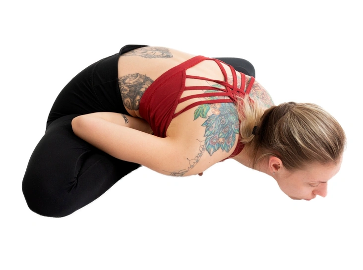 Сидя после Пашчимоттанасаны, подведите стопы к друг другу и разведите колени в стороны. Пятки плотно давят друг на друга, каждой ладонью возьмитесь за середину одноименной стопы, а локти поставьте во внутреннюю часть бедра. Опуская голову, старайтесь мягко уходить в наклон к стопам и сохранять дыхание со звуком. Фиксируйте позу от 5-8 дыхательных циклов.