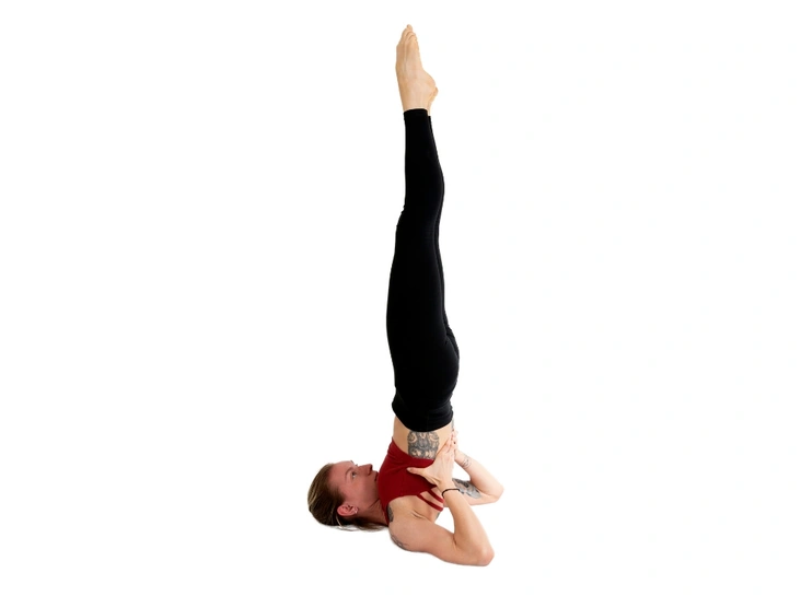- Лежа на спине, обхватите ладони под поясницей, локти и плечи должны быть прижаты к коврику. Вытяните ноги вверх прижатыми друг к другу. В этом положении нельзя двигать шеей, смотреть в разные стороны. Удерживайте его не менее 15 дыхательных циклов.