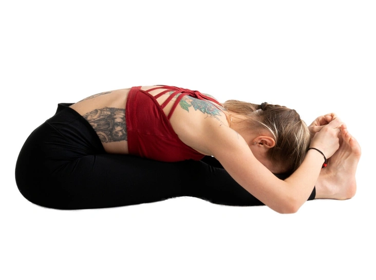 Сидя на коврике, вытяните ноги вперед, пальцы ног смотрят в потолок, колени расслаблены. Наклонитесь вперед к ногам и возьмитесь руками за большие пальцы стоп. Если это пока не получается, ухватитесь за голени, опустите голову на колени и оставайтесь в этой позе 5-7 циклов шипящего дыхания.