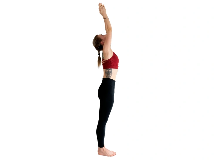 Встаньте на начало коврика, соберите стопы вместе, вытянитесь за макушкой и подтяните низ живота. Вдох: поднимаем руки вверх, соединяем ладони и направляем взгляд на пальцы рук. Выдох: наклон к прямым ногам, пальцами или ладонями касаемся пола возле стоп.