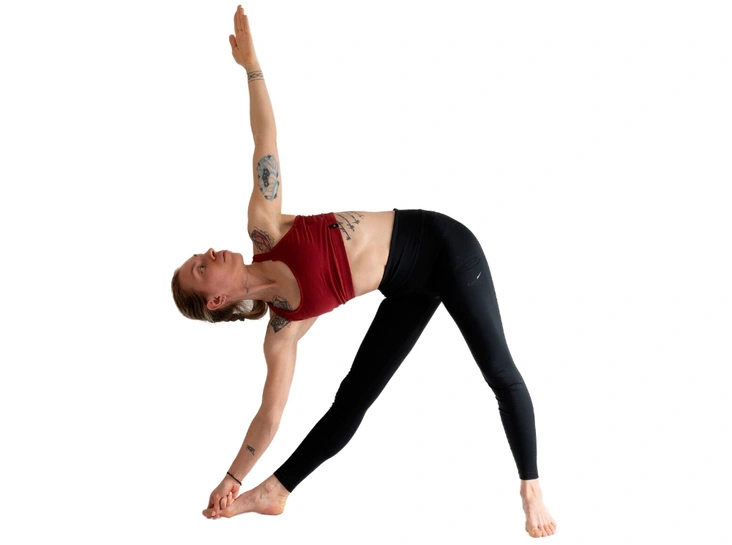 - Разверните правую стопу пальцами вперед, наклонитесь через сторону и захватите большой палец правой ноги правой рукой, левую руку вытяните вверх на одну линию с правой рукой, взгляд поднимайте на левую ладонь.