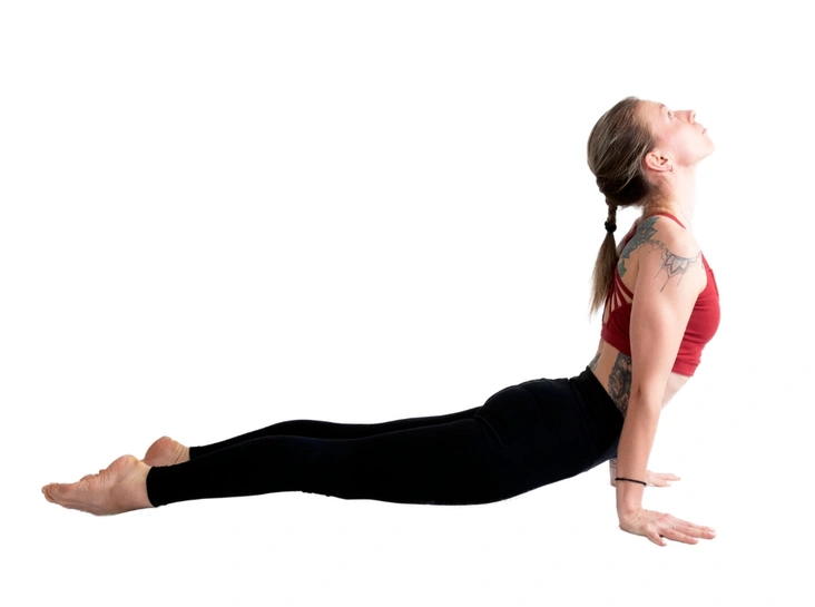 Вдох: отталкиваемся стопами от пола перекатываемся на тыльную часть стоп, держим колени и бедра на весу, опираясь только на ладони, прогибаемся в грудном отделе и выходим в Собаку мордой вверх.
