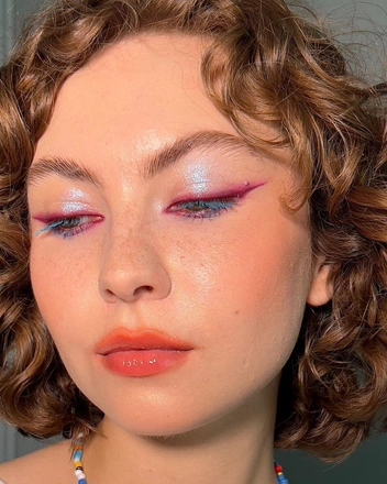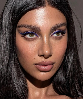 Идеальный способ добавить праздничных вайбов в уже знакомую всем стрелку. Сначала необходимо нарисовать основу — стрелку в любой желаемой форме (читайте также: Как нарисовать идеальные стрелки: пошаговая инструкция). Для этого можно взять кремовый пигмент в темных оттенках. Затем на еще влажное средство нанесите блестки, чтобы добавить желаемое сияние. Все движения важно делать быстро и уверенно — так пигмент не успеет высохнуть, и блестки надежно закрепятся на нем. Если сияющие частички при нанесении осыпались на область под глазами, можно аккуратно приложить клейкую сторону скотча к коже и убрать их — так не повредится тональное покрытие.