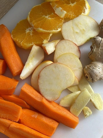 Морковь и яблоко — классическая комбинация для печени и кожи. Бета-каротин из моркови превращается в витамин A, регулирующий обновление клеток. Яблоко добавляет органические кислоты, которые мягко стимулируют пищеварение и помогают усваивать жирорастворимые витамины. Имбирь усиливает термогенный эффект, а масло льна снабжает омега-3 и омега-6 жирными кислотами, которые восстанавливают липидный слой кожи.