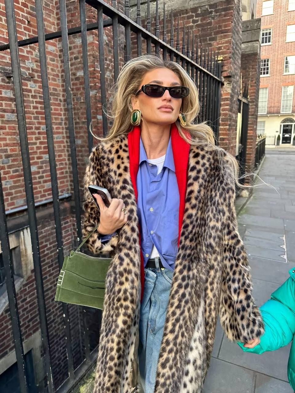 Главное правило: один крупный цветовой акцент и один анималистичный — например, ярко‑красная сумка и тонкий леопардовый ремень или базовая голубая рубашка с леопардовым пальто и красным свитером.