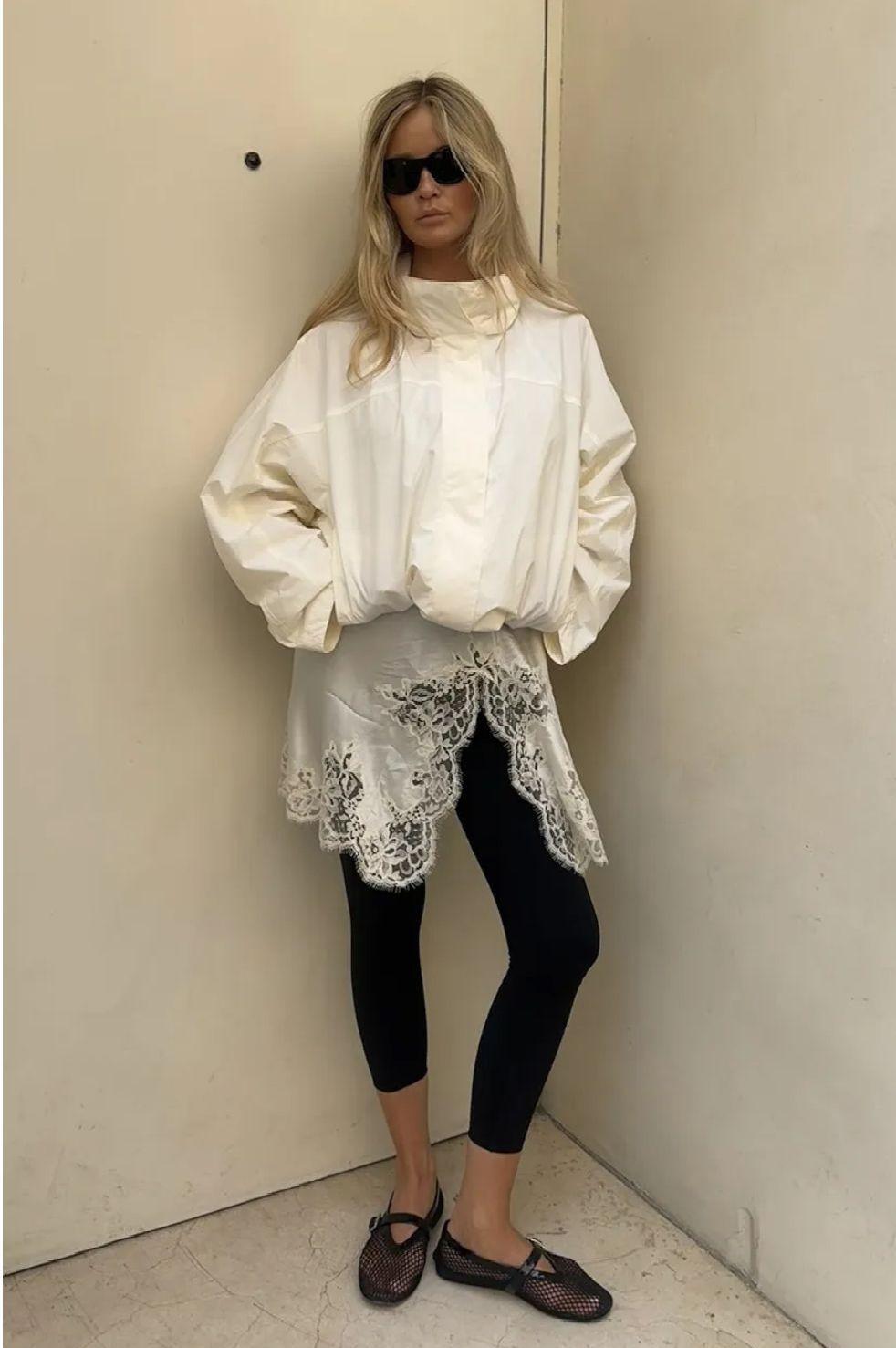 Без ветровки в этом сезоне никуда. Причем в 2026 году ее носят не только с привычным денимом и спортивными брюками, но и с откровенно нарядным низом — кружевом, атласом, шелком, создавая легкий «стилистический конфликт».