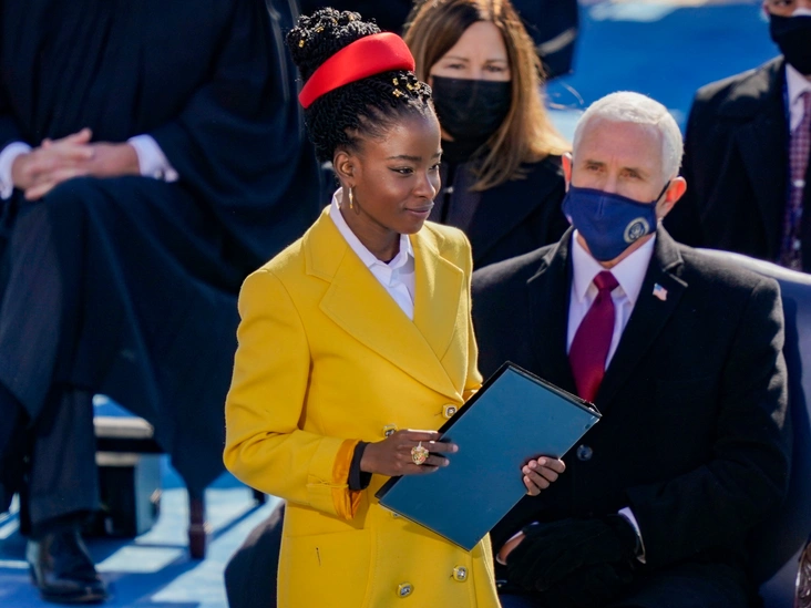 Аманда Горман самым молодым поэтом в истории США, прочитавшим свое стихотворение на инаугурации президента. Пока она декламировала строки собственного произведения под названием «Холм, на который мы поднимаемся», зрители концентрировали внимание не только на трогательных словах, но и на одежде и прически девушки. Объемный огненно-красный ободок Prada на фоне убранных наверх кос Аманды смотрелся почти как корона, сообщая о жизнерадостности и торжественности момента на пару с желтым пальто и огромным перстнем Горман.