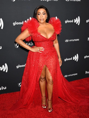 А вот Ниси Нэш-Бэттс не удается подчеркнуть свои формы так, чтобы выглядеть на ковровой дорожке стильно и дорого. Актриса со сногсшибательной фигурой выбирает неудачные платья, блузы и топы, из-за чего чаще всего смотрится нелепо и безвкусно. Например, но у нее неудачно получается подбирать к ней одежду. Например, ее образ для GLAAD Media Awards в красном платье с разрезом и глубоким декольте получился дешевым: дело здесь и в неудачном фасоне, что полнит актрису, и неправильно подобранном вырезом на груди.