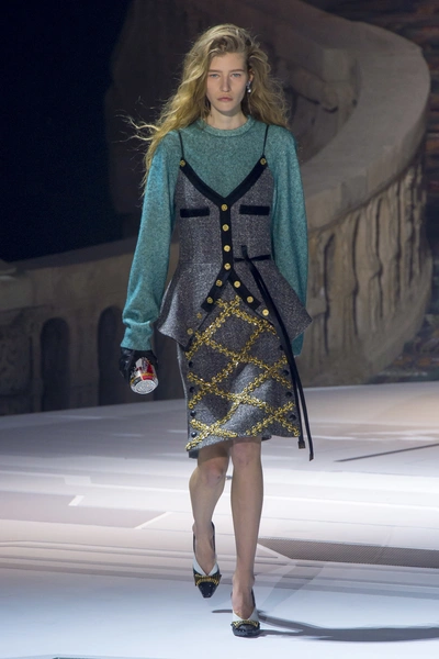 Идея совместить историзм самого посещаемого музея в мире и собственную страсть к футуризму, Жескьеру очень понравилась: она отлично передает суть самой коллекции. В ней одному ему известным образом придворные костюмы эпохи Наполена III сочетаются с униформой космических путешественниц, между которыми, вообще-то, простирается целая пропасть во всех континуумах.