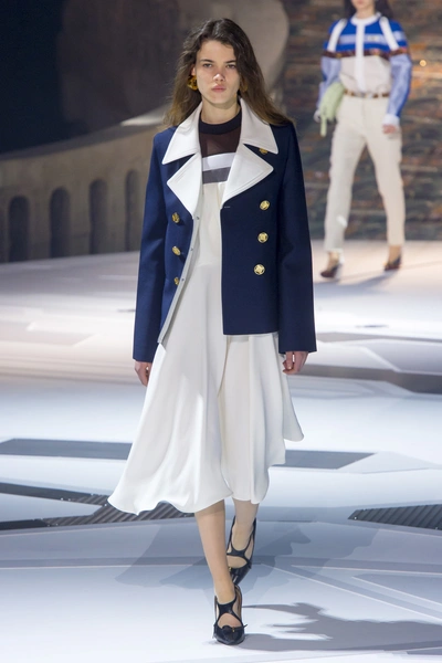 Кроме них, в коллекции появляется целый набор примет самых разных стилей: маскулинизированный милитари, консервативный преппи, остромодный athleisure, мрачноватый гранж... Все это Жескьер лихо закручивает в один большой узел из гусарских мундиров, стилизованных под бомбер, удлиненных топов с баской на тонких бретелях, прямых пальто с объемными аппликациями, напоминающими створки космического корабля, и платьев с объемными вставками по плечевому поясу.