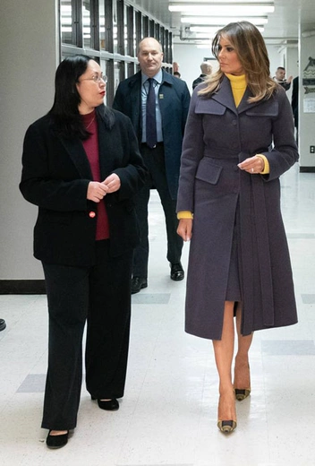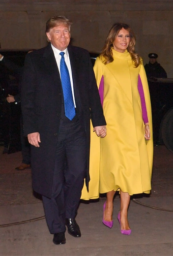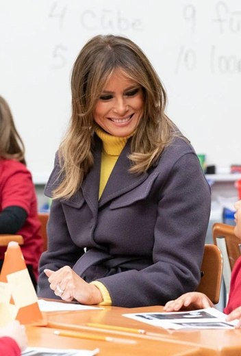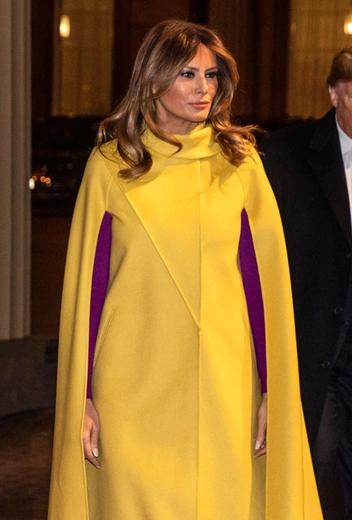 В финале года Мелания решила продемонстрировать умение пользоваться еще одним излюбленным приемом – color-blocking. В декабре президентская чета отправилась в Лондон, чтобы принять участие в 70-м саммите НАТО. В честь юбилея королева Елизавета устроила прием, куда и пригласила лидеров стран вместе с супругами. Делать ставку на цвет решили все самые модные королевские особы и представительницы мира политики. Однако у Мелании вновь получилось выделиться: она решила примерить ярко-желтое пальто-кейп из осенне-зимней коллекции Valentino и скомбинировала его с насыщенным фиолетовым платьем Hervé Pierre – самого платья в наличии нет, потому что оно было создано специально для этого образа. Завершающим штрихом стали фиолетовые лодочки Christian Louboutin, которые перекликались по цвету с платьем.