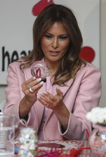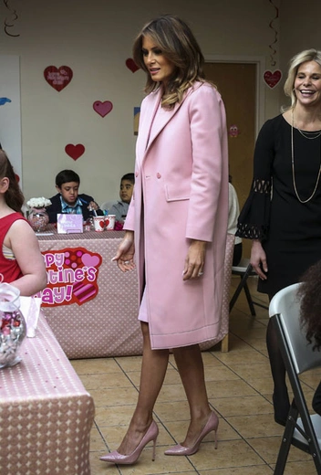 В этом году трибьют в сторону любви показали многие жены политических деятелей высокого ранга. У Мелании образ в честь Дня святого Валентина выглядел довольно лаконичным – напомнить о Дне всех влюбленных она решила при помощи нежно-розового цвета, однако образ получился крайне очаровательным. На этот день у Мелании значилась встреча с детьми в Национальном институте здоровья, и для важного мероприятия первая леди выбрала идеальное пальто оттенка bubblegum от бренда Cédric Charlier, скомбинировав его с платьем в тон и классическими лодочками Manolo Blahnik.
