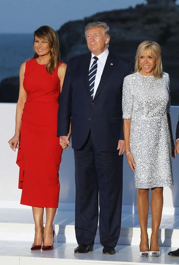 В конце лета, на торжественном ужине для всех участников саммита G7, первая леди США решила продемонстрировать свое полезное умение составлять минималистичные наряды. Перед мероприятием лидеры государств вместе с супругами приняли участие в фотосъемке на набережной у маяка. Мелания появилась в насыщенном красном платье-футляре облегающего силуэта от Alexander McQueen, лодочках Christian Louboutin и выглядела по-настоящему ярко на фоне других гостей вечера.