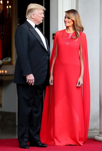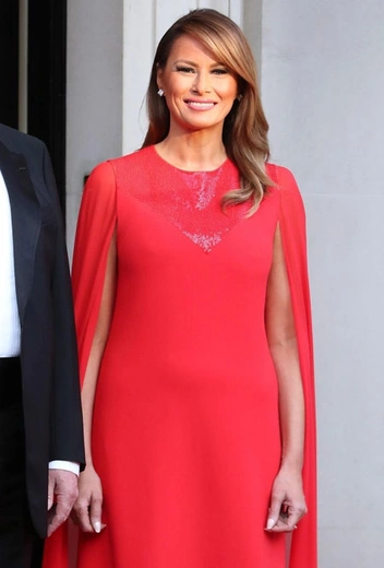 Мелания составляет вечерние образы на раз-два и всегда выглядит в них не только стильно, но и крайне уверенно. Одним из самых впечатляющих вариантов в этом году стало платье-кейп ярко-алого оттенка от Givenchy, которое она примерила во время официального приема в Букингемском дворце. Здесь сложно было избежать сравнений с герцогиней Меган, ее любовью к Givenchy и нашумевшим небесно-голубым кейпом, который она примерила в туре по Австралии и Океании в 2018 году. Однако все совпадения случайны: Мелания не менее преданно любит такие фасоны и часто появляется в роскошных платьях-кейпах на мероприятиях высокого уровня (читайте также: Идеальные платья-кейпы на вечер, как у Мелании Трамп и герцогини Меган).
