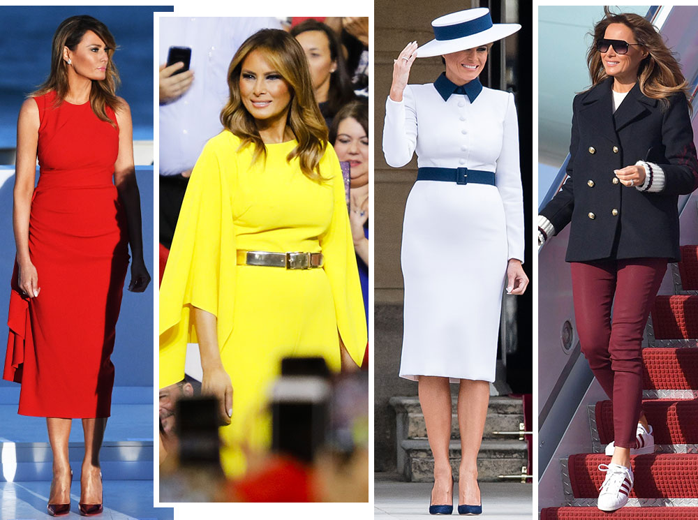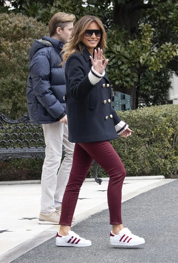 Высказывания о том, что первые леди вынуждены облачаться в чересчур скучные и устаревшие платья-пальто – изживший себя стереотип. Мелания носит абсолютно все (в разумных пределах) и часто показывает стильные и практичные аутфиты, которые мы можем позаимствовать и для себя. Например, во время поездки в штат Алабама она примерила облегающие винные брюки J Brand, уютный свитер, укороченное пальто Tommy Hilfiger и завершила наряд удобными кроссовками adidas Superstar.