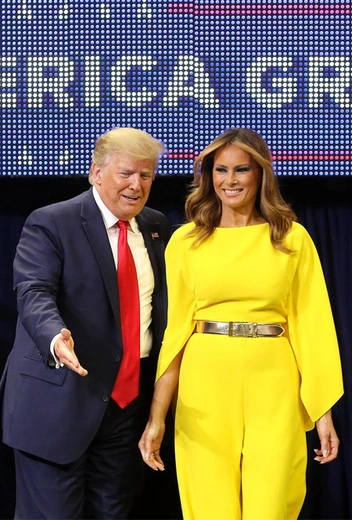 Мелания – одна из немногих первых леди, кто умеет интересно носить желтый цвет, причем как в практичных аутфитах, так и в вечерних образах. Свои умения она смогла показать в день встречи Дональда Трампа с избирателями в городе Орландо, где действующий президент объявил о желании баллотироваться в 2020 году. Но кажется, в этот день все внимание было направлено не на действующего президента США, а на его супругу, которая выбрала для мероприятия лимонно-желтый комбинезон Ralph Lauren с металлизированным ремешком и легко выделялась в многотысячной толпе. Выбор бренда также был для Мелании особенно символичным – именно Ральф Лорен разрабатывал нежно-голубой костюм Мелании для церемонии инаугурации Дональда Трампа.