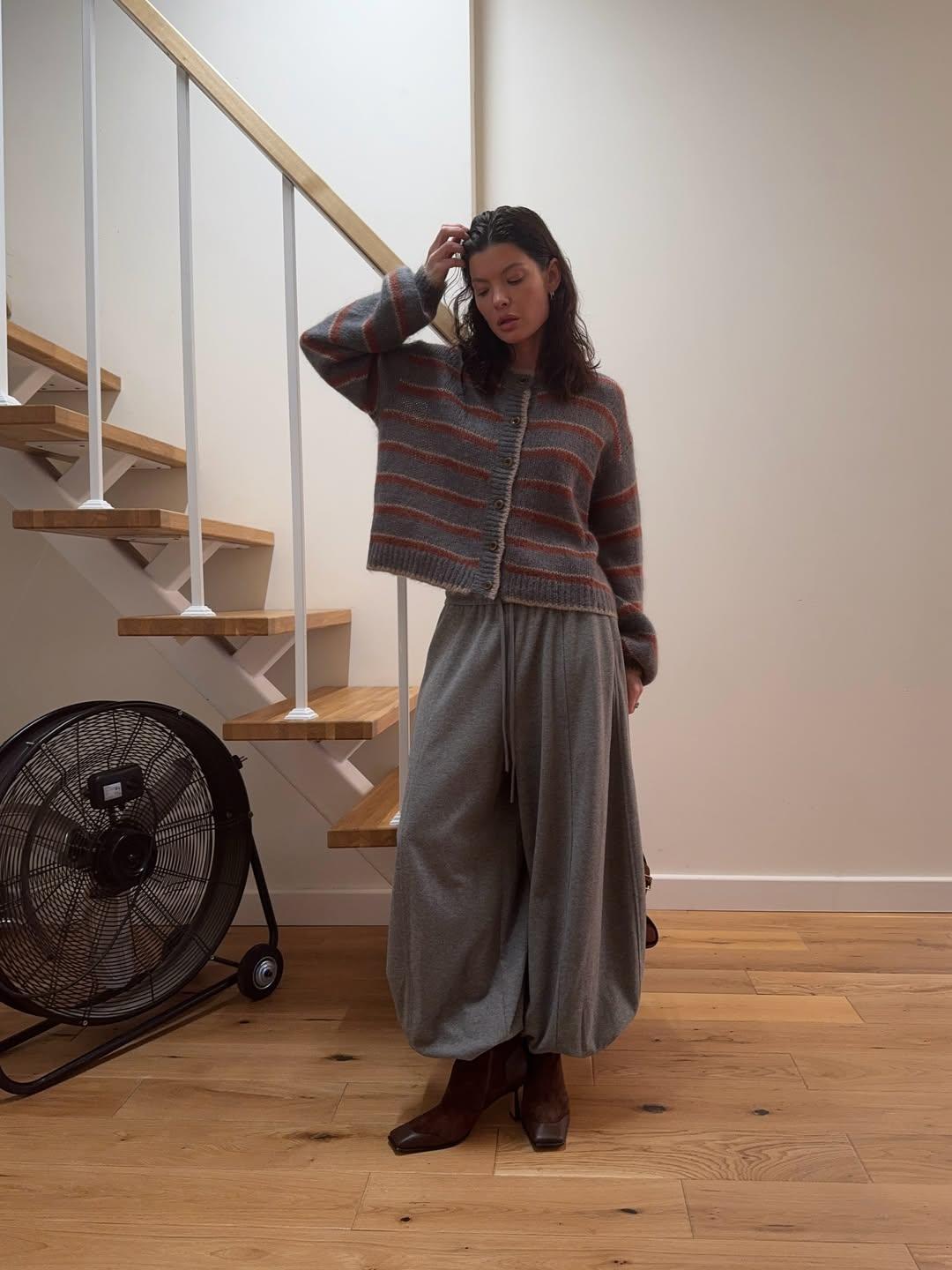 Свободный укороченный крой и мягкие контрастные полосы создают расслабленное, немного артистичное настроение, а нейтральная серая база позволяет носить его и с актуальными брюками О-силуэта, и с прямыми джинсами, и даже поверх атласного платья.
