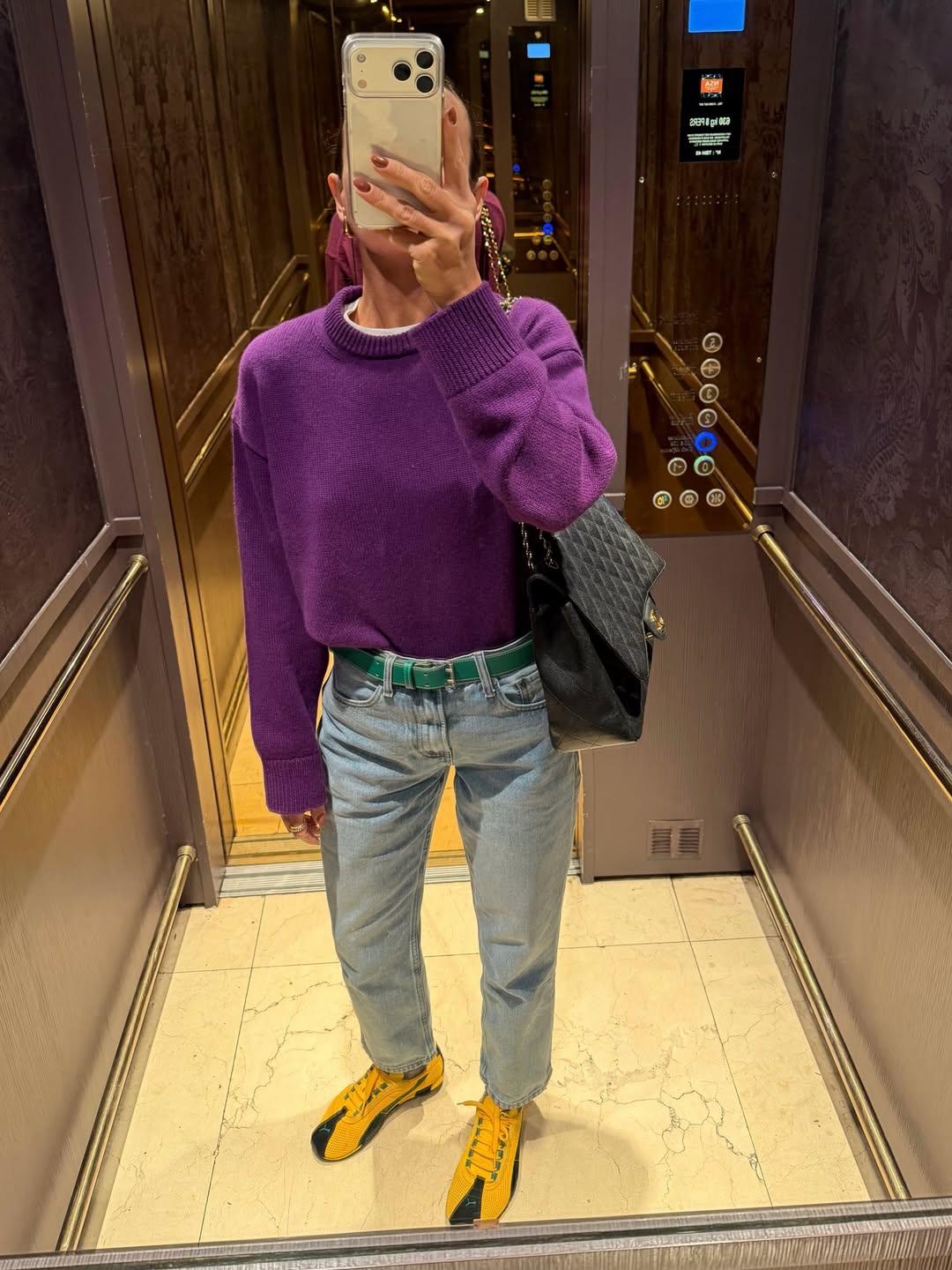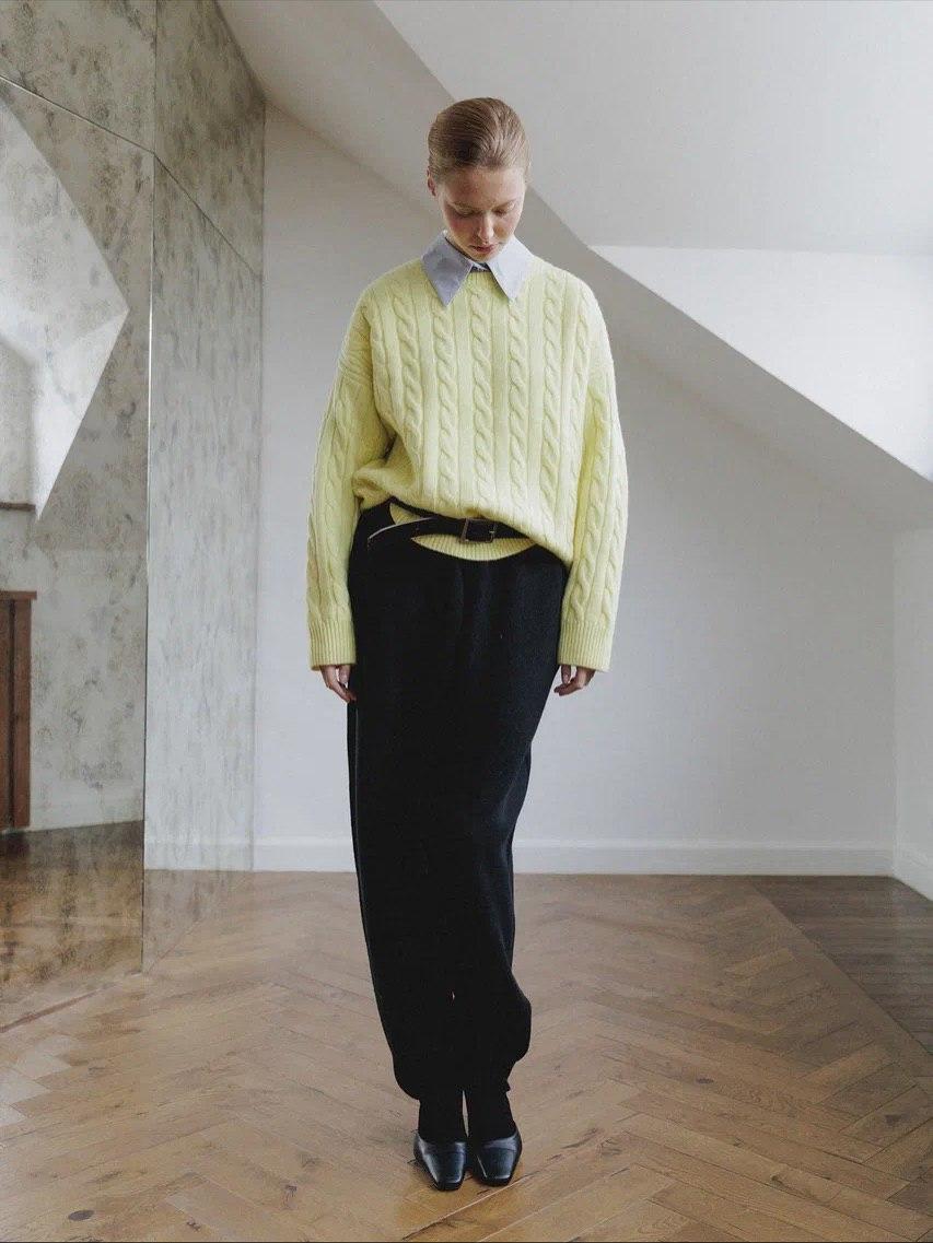 Сливочно-лимонный джемпер работает как личный фильтр повышенной яркости: даже в серый день он подсвечивает кожу и делает образ визуально свежее.