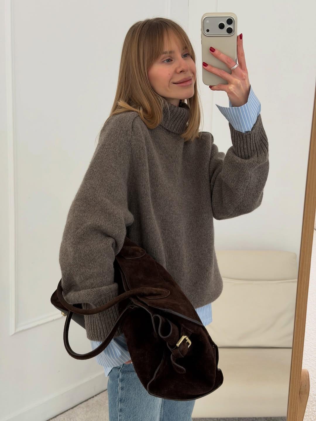 Объемный ворот мягко обнимает шею, а свободный, но собранный силуэт красиво смотрится с рубашкой, выглядывающей из‑под низа, и прямыми джинсами, создавая чуть богемный, но по‑деловому аккуратный образ (читайте также: 10 элегантных сочетаний, которые будут в тренде в 2026 году).