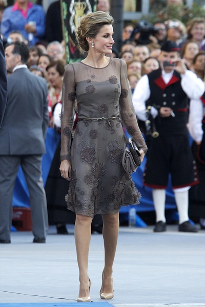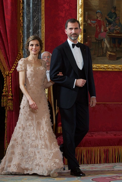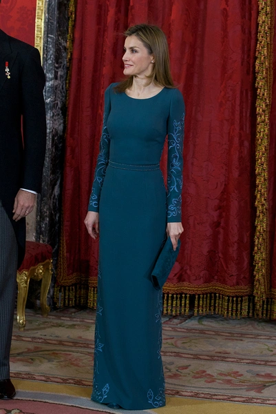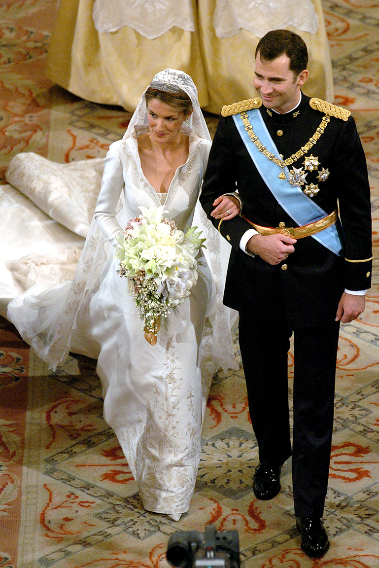 Принцесса Летисия всегда была элегантной женщиной, в родной стране ее даже называют «лучшим послом испанской моды». Для своей свадьбы она выбрала платье от испанского дизайнера Мануэля Пертегаса с высоким воротником, украшенным вышивкой, и длинным шлейфом.