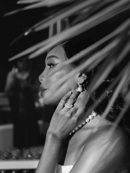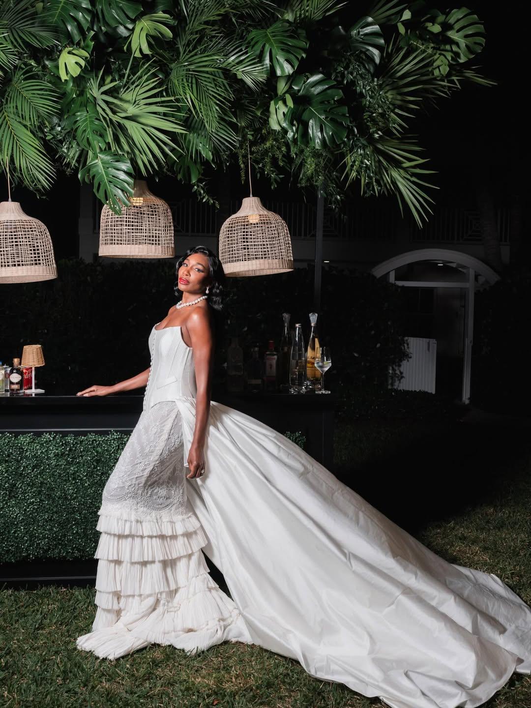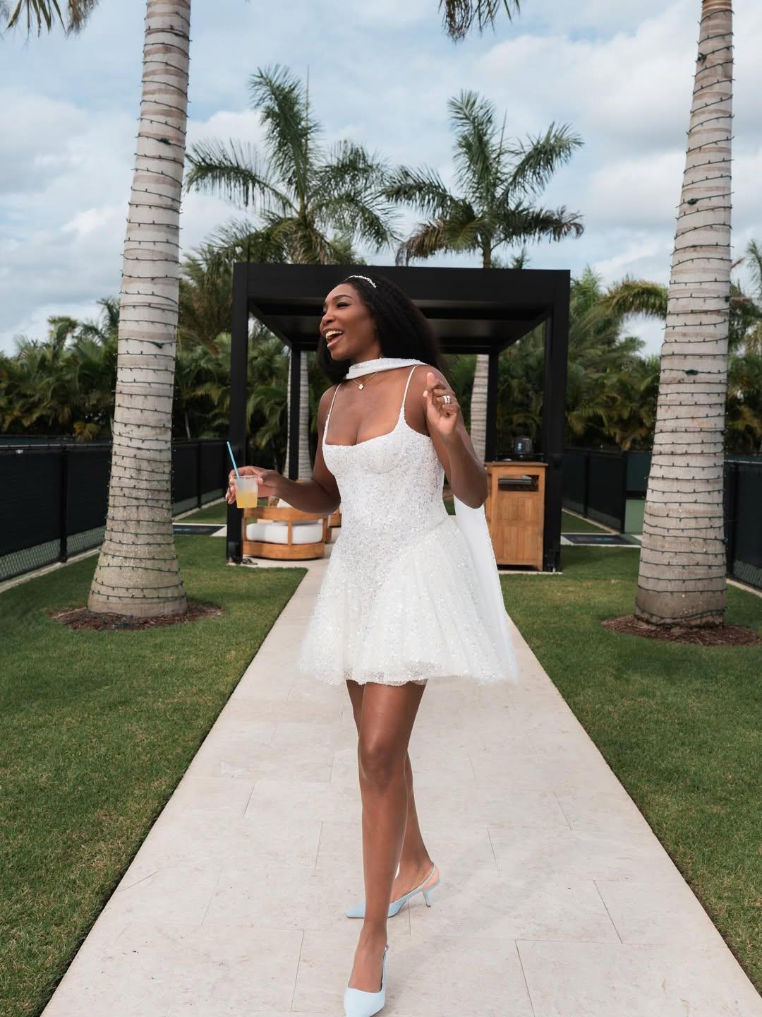 «Я хотела платье, которое понравилось бы Андреа и было бы волшебным и идеальным для свадьбы во Флориде», — рассказывает Винус. Она хотела примерить его заранее, но образца не было в наличии. «Я была в Париже всего один день и сказала: „Мне нужно пойти и примерить это платье“. Это было во время Недели моды. Было безумно, но мы как-то справились. Я хотела, чтобы приехала моя сестра Иша, и когда она увидела платье, она заплакала. Это было идеально. То, как оно сверкает, его прозрачность — оно напоминает мне океан или море».