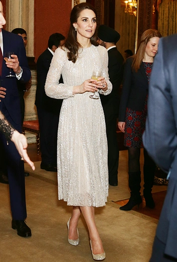 Британский бренд Erdem любят не только в Британии, но и по другую сторону Северного моря — в Норвегии. Однажды королевские особы для своих выходов выбрали идентичное серебристое платье, однако и в этом случае произошло так же, как и с Меган Маркл: первой в этом серебристом туалете была запечатлена Метте-Марит в ноябре 2016-го года. Кейт надела его тремя месяцами позже — в феврале 2017-го, когда посетила торжественное мероприятие, посвященное запуску года английско-индийской дружбы.