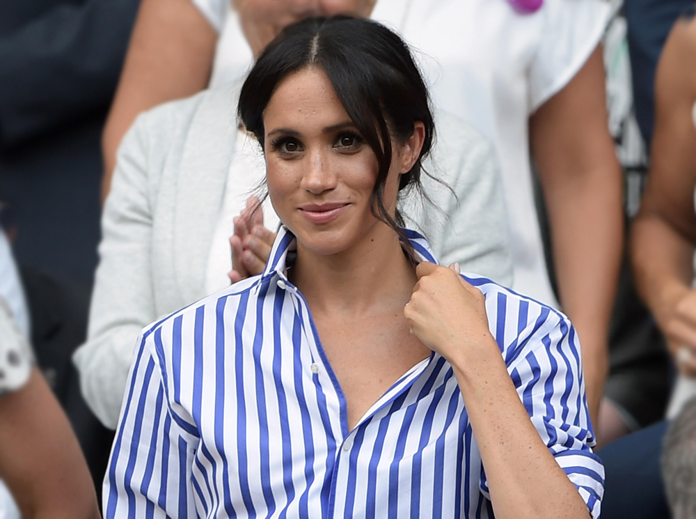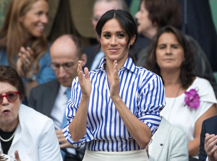 14 июля теперь уже не невеста, а законная жена Гарри впервые посетила Уимблдон в качестве полноправного члена британской королевской семьи. Компанию герцогине Сассекской составила другая «современная Золушка» — Кэтрин Кембриджская. Для этого, еще одного «первого» выхода Меган подобрала кремовые брюки-палаццо и рубашку в полоску от Ralph Lauren, дополнив наряд шляпой Maison Michel и сумкой Altuzarra.