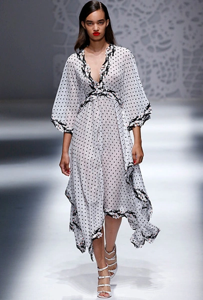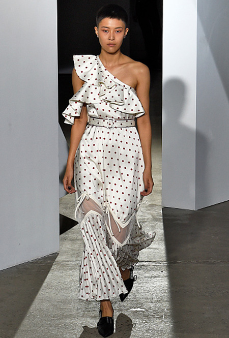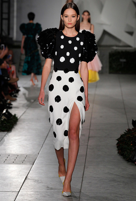 В этом сезоне актуальной будет черно-белая гамма или горошины приглушенных оттенков (вроде винного, болотного или горчичного) на нейтральном фоне. Поскольку полька-дот ассоциируется с ретро-стилем, можно продолжить тему, выбрав платье с воланами. Или наоборот — остановиться на ультрасовременной модели асимметричного или подчеркнуто минималистичного кроя.