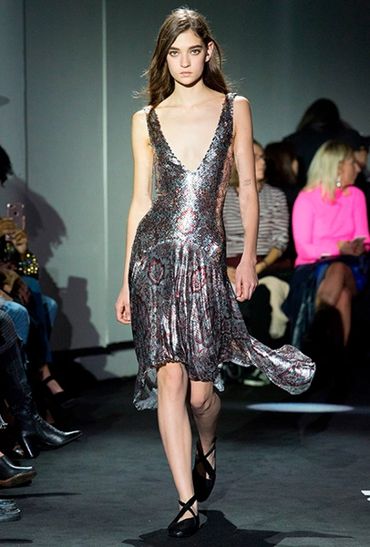 Выбирая платье с бахромой, обратите внимание на длинную отделку: она и выглядит и актуальнее, и безопаснее с точки зрения оптических иллюзий. Кроме того, платье в стиле Золотого века Голливуда — всегда актуальное решение для праздничных выходов. В компанию ему подбирайте простые и лаконичные аксессуары.
