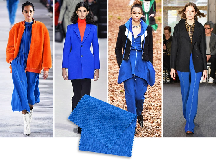 Единственный синий оттенок, представленный в сезонной подборке, получил название «Синяя туманность» (Nebulas Blue). Если сравнивать его с популярным в прошлом году navy, то «туманность» будет смотреться значительно светлее. По словам Эйсман, еще один вариант синего «олицетворяет непрекращающийся роман модной публики с этим цветом». Особенно эффектно он смотрится в паре с оранжевым — как на фото выше.