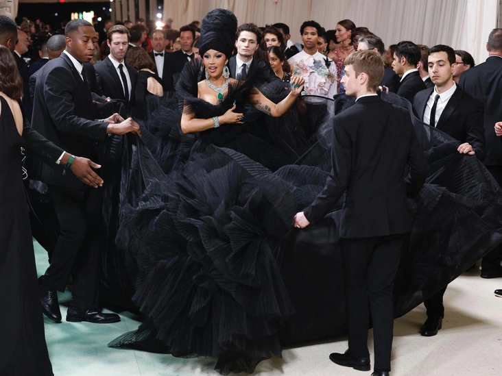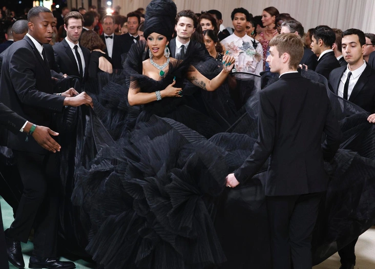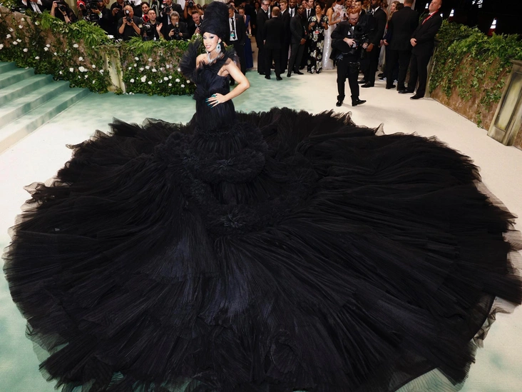 Карди всегда выглядит эффектно, но такого образа с намеком на злодейку Урсулу от нее никто не ожидал. Платье из черного тюля от китайского бренда Windowsen Карди помогали переносить около десяти крепких помощников, потому что звезда, что называется, не могла в нем ни петь, ни танцевать. Зато как удачно стилисты певицы проработали ее аксессуары — изумрудное колье, серьги и кольцо, а также метровый тюрбан мы не забудем еще очень долго.