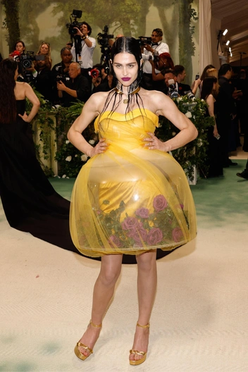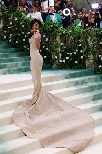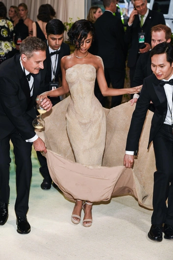 В 2021 году Зендея ошеломила весь мир своим облегающим платьем от Balmain, которое выглядело, как накинутая ткань на голое тело. Теперь Оливье Рустен решил взяться за еще одного новичка мира моды и обыграть пустынную тему. Приятно отметить, что дизайнер и его подопечная стали первыми гостями Met Gala, кто так хорошо проработал посыл бала (напомним, тема в этом году «Сад времени»). Вместо 1001-го цветочного наряда Tyla выбрала платье в форме песочных часов. Ну и что, что певицу пришлось поднимать на каждую ступень, потому что она не могла сделать и шагу?