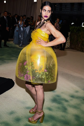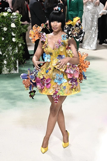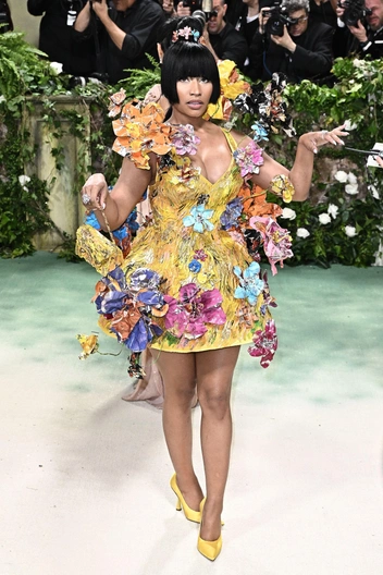 А вот Ники и ее команда решили по-полной обыграть цветочную тему. В этом году Marni сделали для певицы короткое платье с объемными цветами — настолько объемными, что она даже не смогла опустить руки на дорожке.