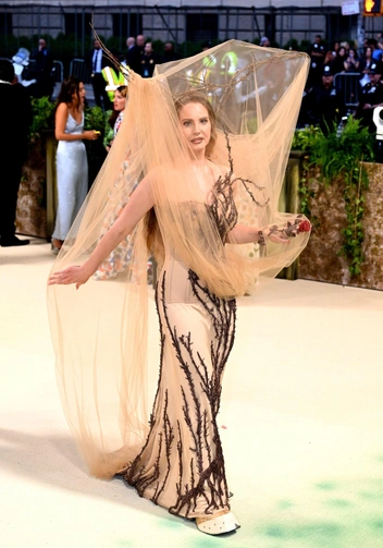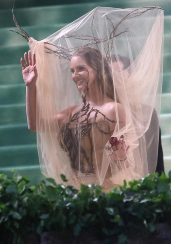 В этом году Лану сопровождал сам дизайнер ее платья — нынешний креативный директор Alexander McQueen Шон Макгир. Бежевое платье с ветками дерева, расшитыми кристаллами, могло бы быть удачным — если бы не рога (в которых странным образом затесалась тюль). Но если на красной дорожке такой аксессуар представить можно, то как Лана потом присоединилась к ужину (и не покалечила ли кого-то своими рогами)?