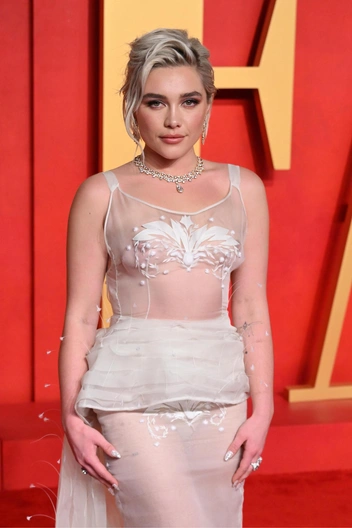 В тот же вечер и актриса Флоренс Пью показала свою версию «голого» образа, надев платье Valentino. Собственно, благодаря этому наряду в 2024 году заговорили об изменениях в стиле (а может и характере) актрисы, которая раньше одевалась более традиционно.
