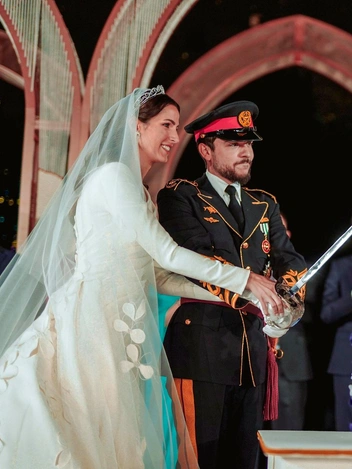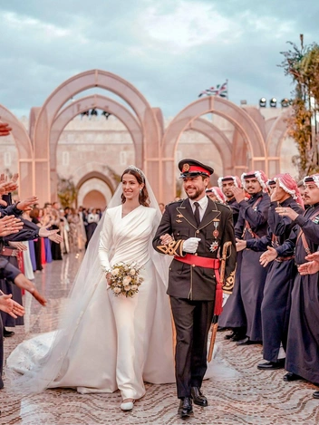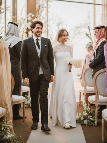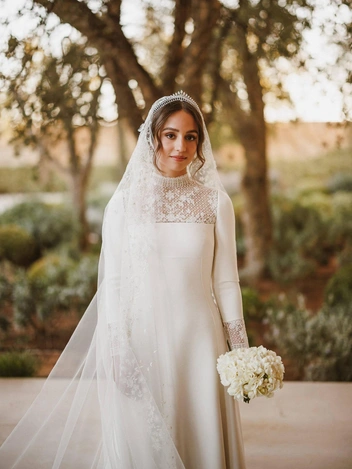 В 2023 году король Иордании Абдалла II отправил в супружескую жизнь не только свою дочь, но и сына Хусейна, который женился на архитекторе Раджве Аль Саиф из Саудовской Аравии. Свадьба молодоженов прошла по всем традициям: перед ней мы наблюдали Ночь хны, а после — кропотливую подготовку к знаменательному дню. Девушка отдала предпочтение лаконичному платью Elie Saab с драпировкой и пышным подолом, украшенном цветами. Наряд украшала полупрозрачная фата, что крепилась за тиару ювелирного Дома Fred. Головной убор тоже несет в себе значение: узоры повторяют фразу «Надежда на бога», так как в переводе с арабского языка имя невесты означает надежду.