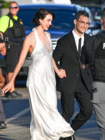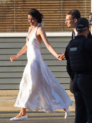 Американская актриса придерживается в стиле лаконичности и дорогой простоты, поэтому для свадебного образа выбрала романтичное белое платье-халтер в бельевом стиле, украшенное блестками. К нему она подобрала не классические лодочки и не босоножки на шпильке, а модные балетки Мэри-Джейн с квадратным мысом. Вышла замуж она за продюсера Джека Антоноффа спустя два года после первых слухов об их отношениях.