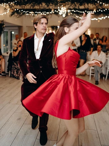 Позже знаменитость надела еще одно белое платье Philosophy di Lorenzo Serafini, но уже в силуэте New Look, а для танцев она выбрала небанальный наряд — алое мини венгерской марки Mero с пышной юбкой, в то время как Дилан Спроус вальсировал вместе с ней в бархатном бордовом костюме. За украшения в образах жениха и невесты отвечал Tiffany & Co.