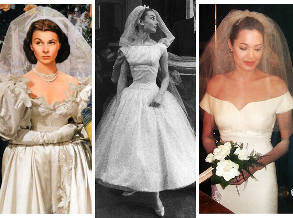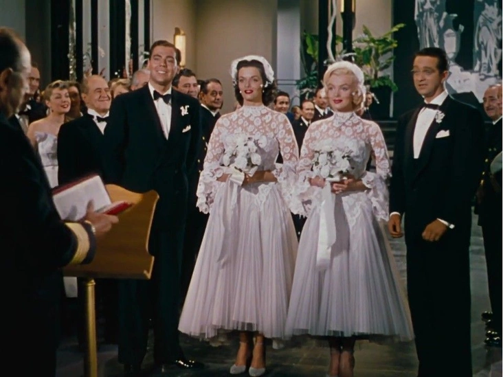 В финале знаменитой музыкальной комедии «Джентльмены предпочитают блондинок» две подруги-артистки, роли которых исполняют Джейн Рассел и Мэрилин Монро, выходят замуж в одинаковых свадебных нарядах, которые придумал известный голливудский художник по костюмам и друг Монро Уильям Травилла. Лиф из кружева и юбка актуальной для 1953 годов длины смотрятся на героинях крайне нежно и элегантно. Дополняют образы невест изящные белые шляпки с вуалью.