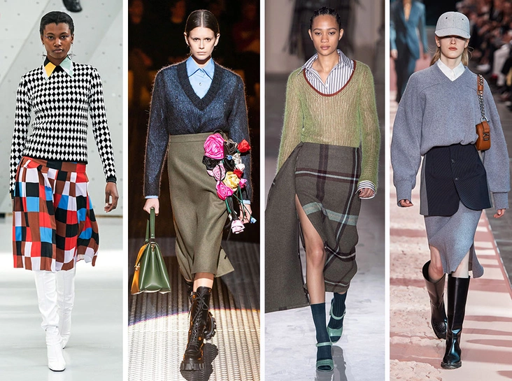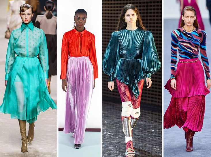 Глобальный тренд, который также перекочевал из коллекций предыдущего сезона – плиссированные вещи, причем далеко не только в виде уже ставших классикой юбки-миди. Присматриваем себе плиссированное платье из металлизированной ткани на вечер, а для офисных будней – классическую костюмную юбку к жакету или уже известный нам ансамбль из рубашки с джемпером.