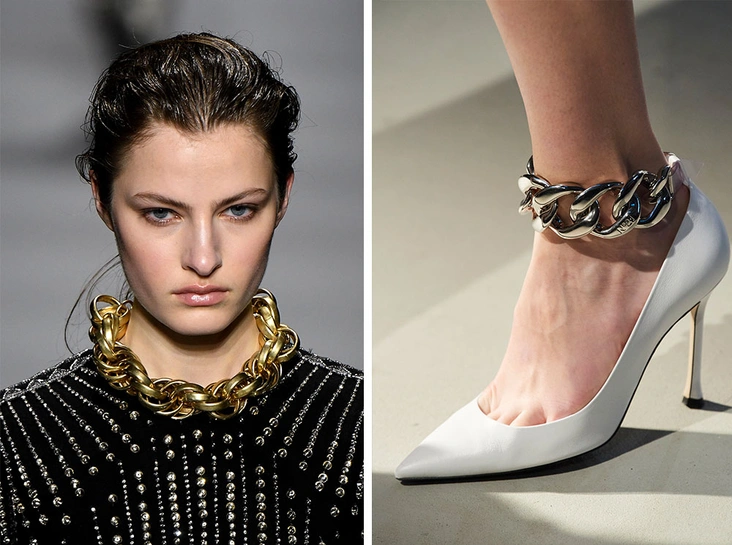 В новом сезоне этот тренд проявляет себя не столько в украшениях, сколько в деталях образов. Золотые кольца украшают вырезы платьев Bottega Veneta, пластиковые звенья дополняют красочные сумки MSGM, а крупные цепи обвивают щиколотки моделей с показа No. 21 (читайте также: Как носить крупные цепи: 4 самых модных варианта).