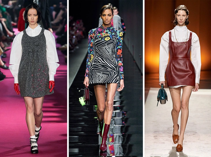 Одна из самых функциональных вещей будущего сезона – укороченные платья-сарафаны. Такие станут универсальным приобретением: их можно носить и в одиночку, и в ансамбле с другими вещами – классическими рубашками, футболками, водолазками и свитерами. Любители ярких решений могут присмотреться к варианту, который предлагает Донателла Версаче: мини-сарафан с акцентным футуристичным принтом она сочетает с красочной водолазкой с цветочным орнаментом.