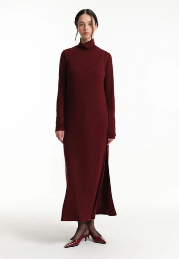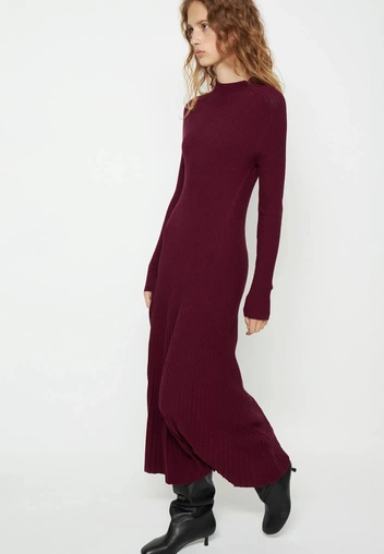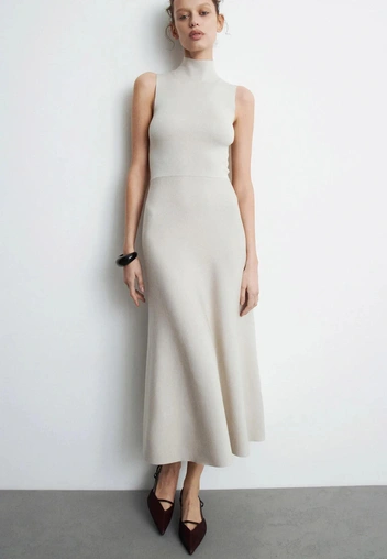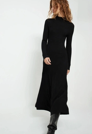 Отдельная «трикотажная лига» — платья-лапша. Благодаря вертикальному рубчику они визуально вытягивают силуэт и подчеркивают фигуру. Такие модели легко вписать и в офисный дресс-код (добавить жакет и сапоги), и в повседневные образы с пуховиком и массивными ботинками.