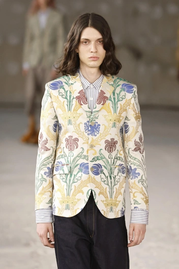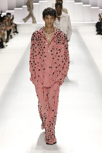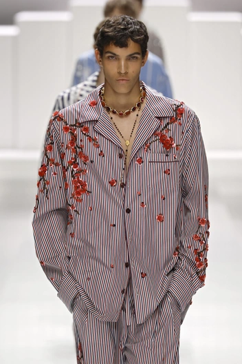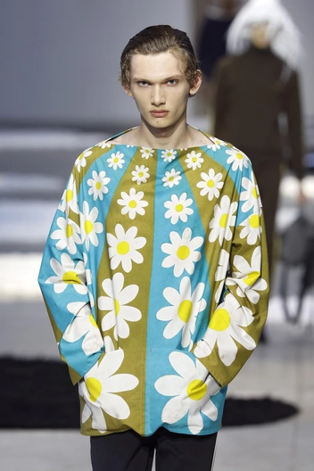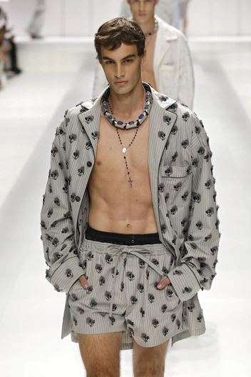 На мужских показах мы привыкли видеть доминанту геометричных узоров, таких как полоска или клетка, а вот яркие цветы на них встречаются не так часто. Дизайнеры летнего сезона 2026 года исправили положение: цветы в разных исполнениях — от страз на пижамах Dolce & Gabbana до шуточных ромашек на Prada — будут сопровождать мужской гардероб как минимум полгода.