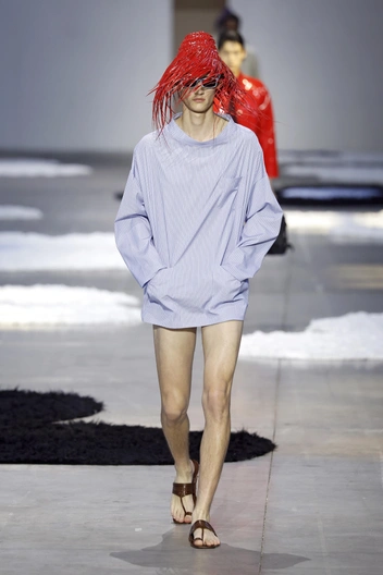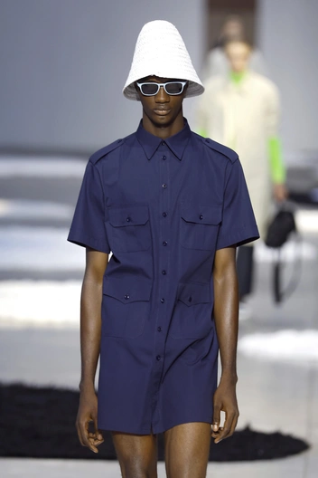 Продолжая разговор о мужской рубашке — в нашем гардеробе она часто выполняет функцию платья из-за своей длины. Дизайнеры решили, что эта опция должна быть доступна не только женскому полу, но и, собственно, изначальным обладателям этой вещи, и выпустили моделей в платьях-рубашках. На показе Prada — мужчины носят рубашки в расслабленно-резортном настроении, сочетая с сандалиями на один палец и панамой.