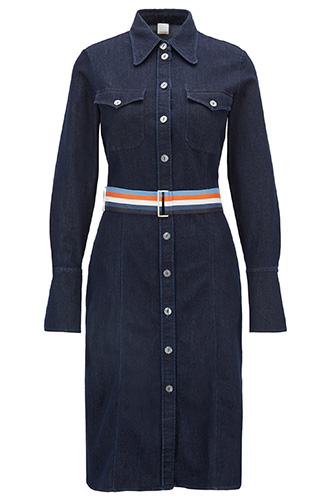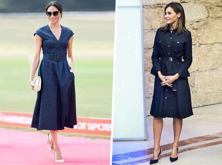 Стоит отметить, что под собирательным «платья из денима» кроются два совсем непохожих наряда. Выбор Меган — платье в стиле 50-х годов с пышной юбкой и коротким рукавом, которое для герцогини Сассекской сшили в Carolina Herrera. В качестве аксессуаров — очки от Tom Ford, лодочки от Aquazzura и клатч от J.Crew. Летиция же сделала ставку на облегающее платье-рубашку от Hugo Boss, дополнив его резным клатчем цвета коньяка (даже самые преданные поклонники испанской монархини не установили его происхождение) и босоножками от все той же Carolina Herrera.