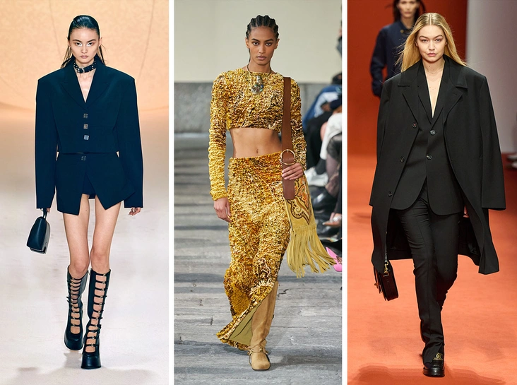 От классических сетов с жакетом, до комплектов с кроп-топом и миди-юбкой — костюмы продолжают удерживать лидирующие позиции. Только через полгода привычные двойки заменят эффектные костюмы с брюками, жакетом и пальто, тройки с жилетом, а также сеты с юбкой или шортами. Костюмная ткань уступит место вельвету, бархату и трикотажу, как у Gucci и Etro.